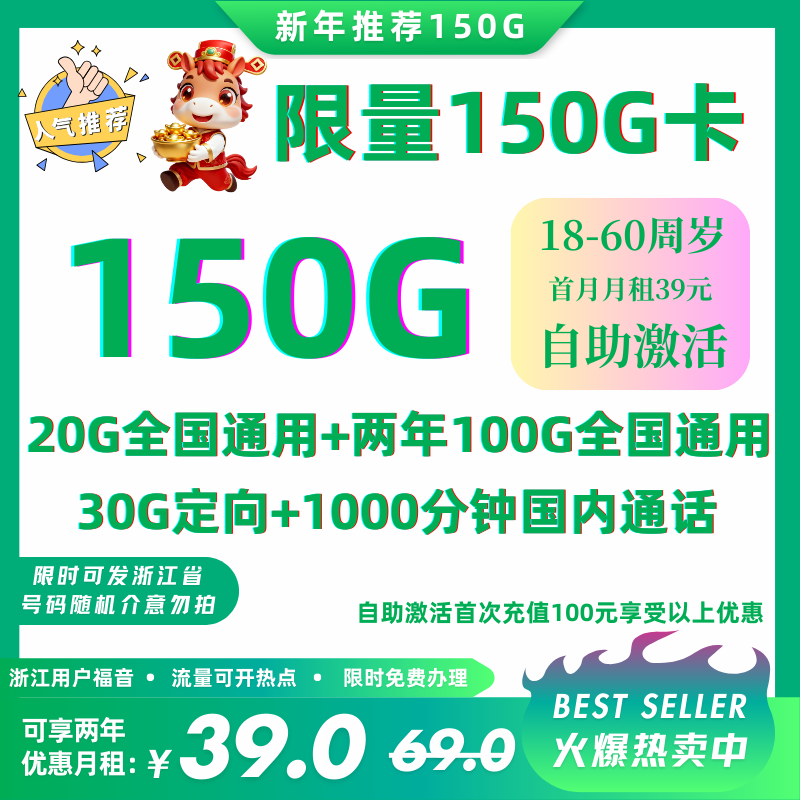 39元150G全国通用流量+100分钟国内通话(两年套餐)