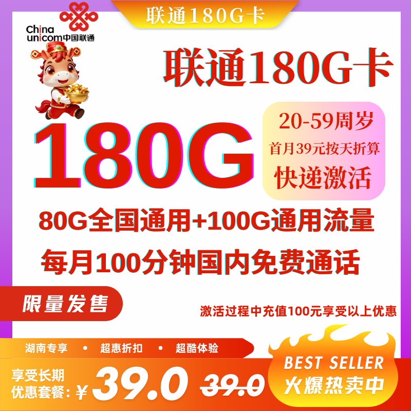 39元180G全国通用流量+100分钟国内通话(长期套餐)