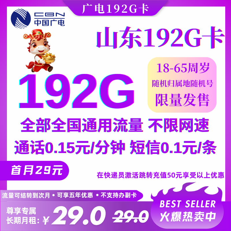 29元192G全国通用流量+0.15元/分钟(首月不免费,山东随机归属地随机号)